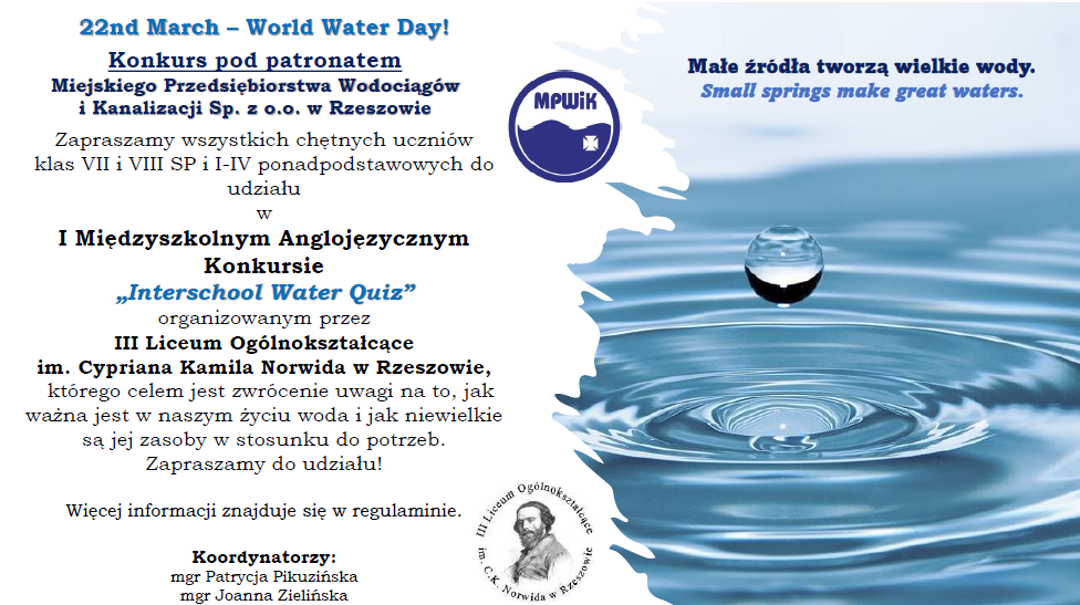III LO w Rzeszowie zaprasza na I Międzyszkolny Anglojęzyczny Konkurs ”Interschool Water Quiz” pod honorowym patronatem Miejskiego Przedsiębiorstwa Wodociągów i Kanalizacji Sp. z o. o. w Rzeszowie. Konkurs skierowany jest do uczniów klas VII – VIII SP i uczniów klas I – IV szkół ponadpodstawowych.