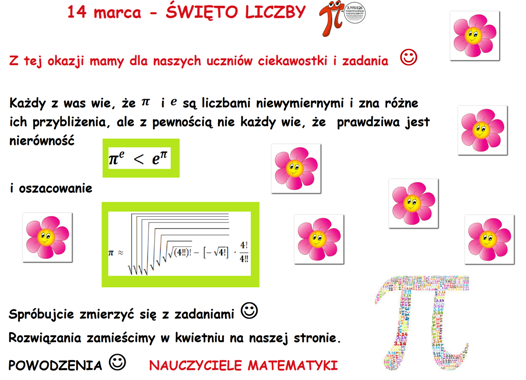 Datę 14 marca w notacji amerykańskiej zapisuje się jako 3.14, co kojarzy się z przybliżeniem liczby Pi. Wiele amerykańskich szkół obchodzi wtedy święto matematyki tzw. Pi Day. Od 1988 roku jest to oficjalne święto w San Francisco, uznane zostało też (niewiążącą) uchwałą Izby Reprezentantów amerykańskiego Kongresu.  Zwyczaj ten przywędrował także do Polski. Od 2020 roku 14 marca obchodzony jest Międzynarodowy Dzień Matematyki proklamowany rezolucją 40. sesji Konferencji Generalnej UNESCO w listopadzie 2019. Z tej okazji nauczycielki i nauczyciele matematyki z naszej Szkoły przygotowali dla uczniów ciekawostki i zadania związane z liczbą π. Życzymy uczniom dobrej zabawy!