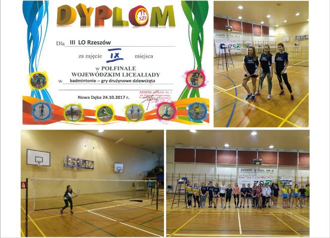 24.10.2017 r. w Nowej Dębie uczennice III LO w Rzeszowie w składzie: Andżelika Nieroda 1c, Aleksandra Świątoniowska 1c, Weronika Kus 1d zdobyły IX miejsce w Półfinale Wojewódzkim Licealiady w badmintona - gry drużynowe. W zawodach uczestniczyło 20 drużyn. Trenerem badmintonistek był mgr Wiesław Pyzia.